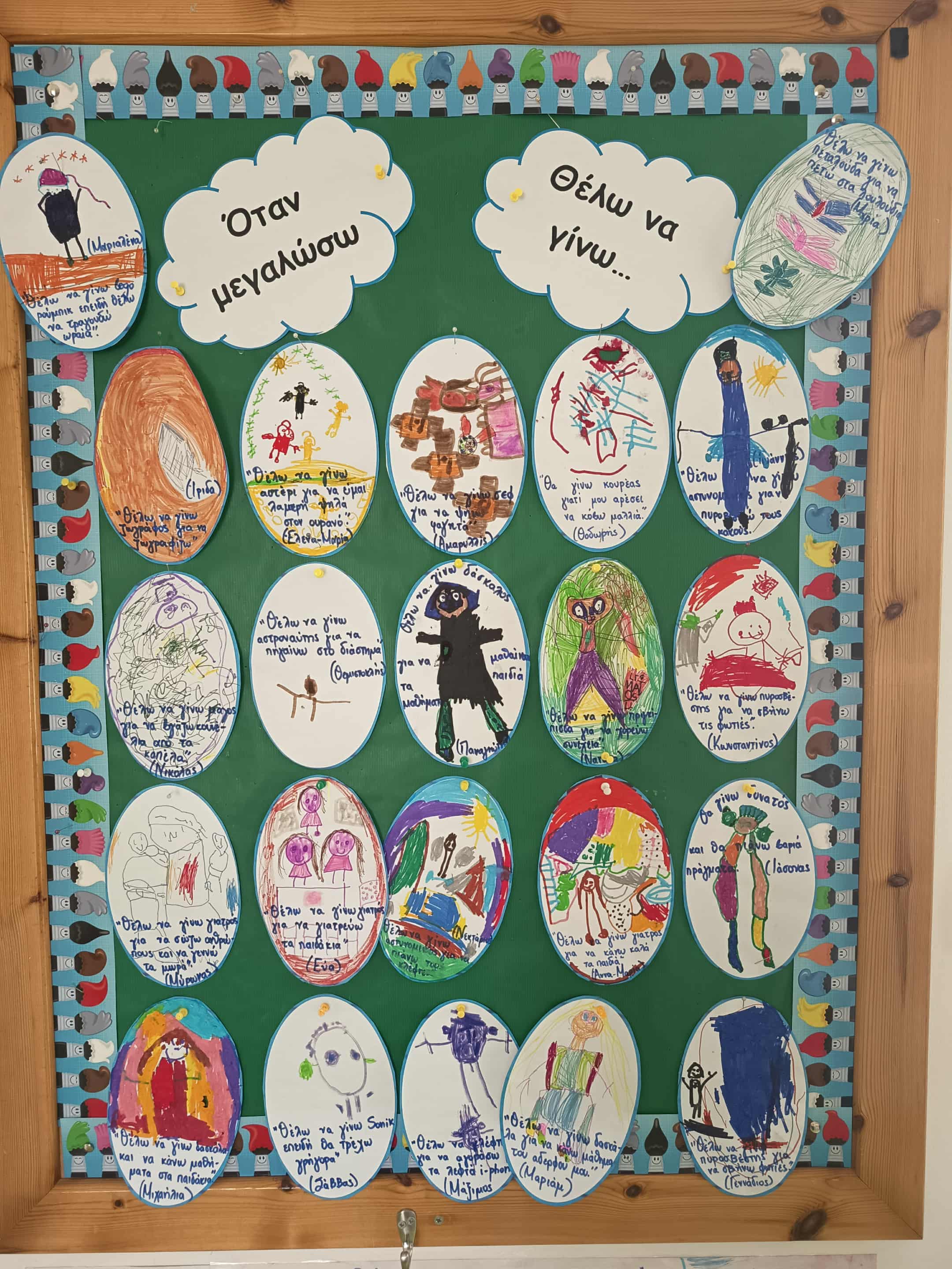Μέσα από το παραμύθι συζητήσαμε με τα παιδιά για το πόσο σημαντικό είναι να κάνουμε αυτό που αγαπούμε ακόμα και όταν μεγαλώσουμε και θα πρέπει να επιλέξουμε το δικό μας επάγγελμα. Ζωγραφίσαμε αυτό που ονειρευόμαστε να γίνουμε όταν θα μεγαλώσουμε και αιτιολογήσαμε τις απαντήσει ς μας.