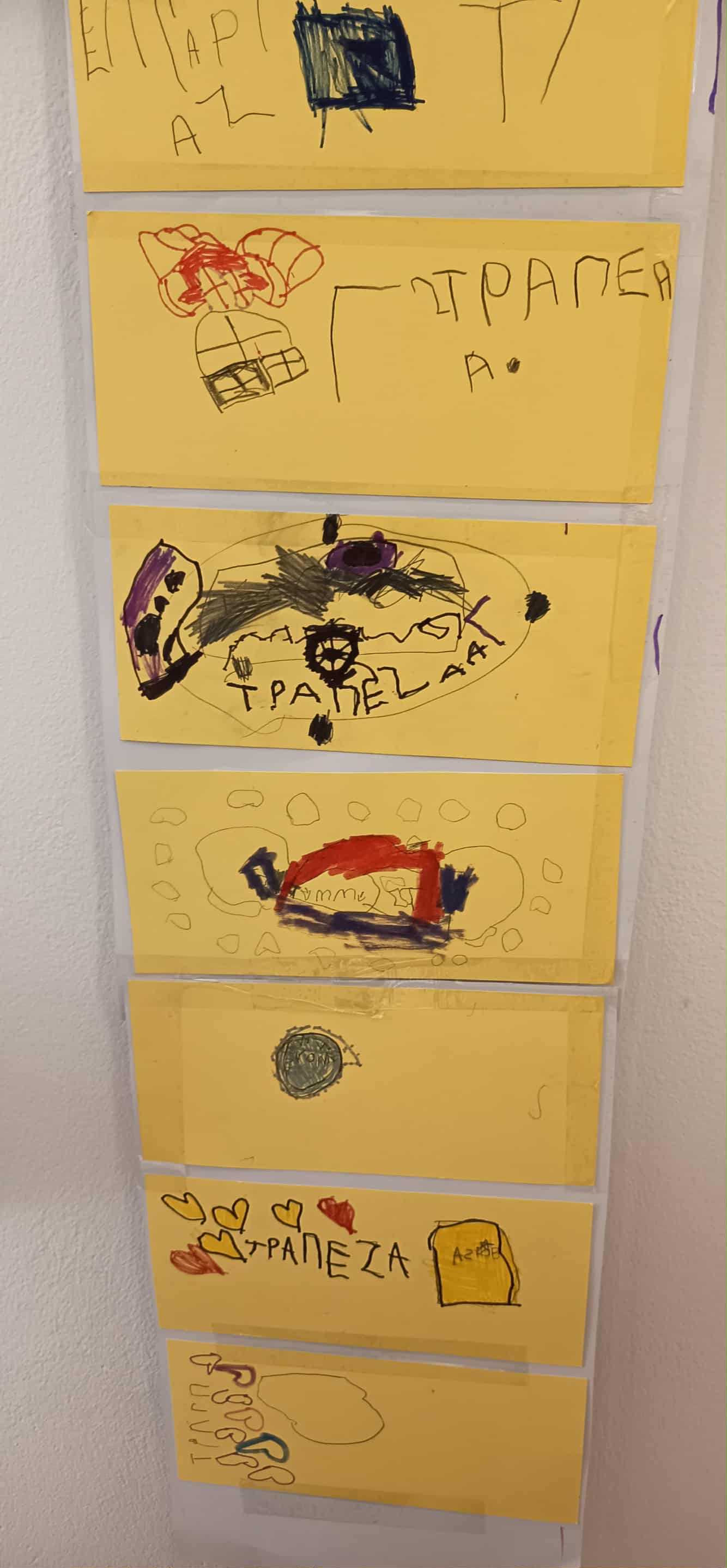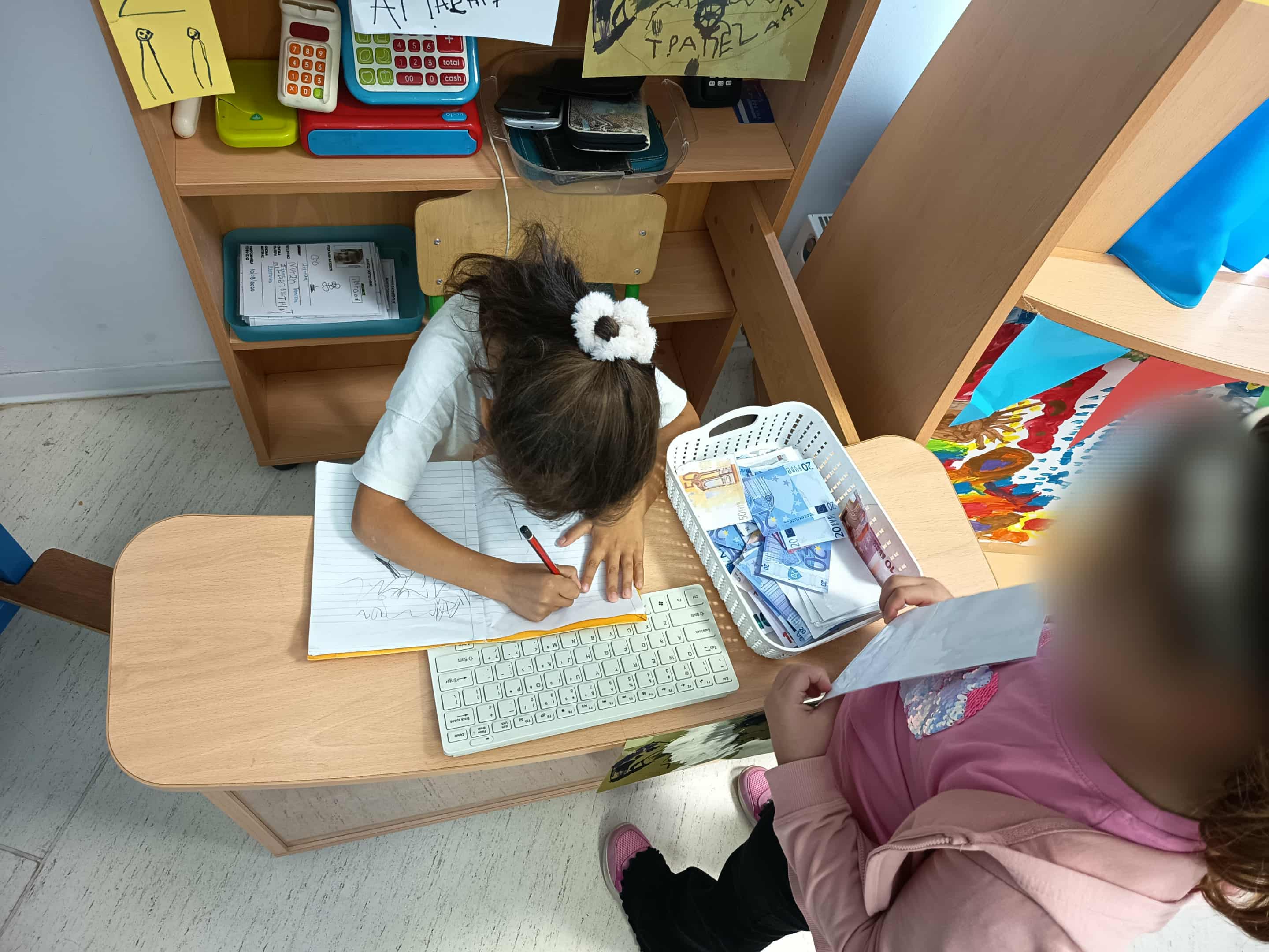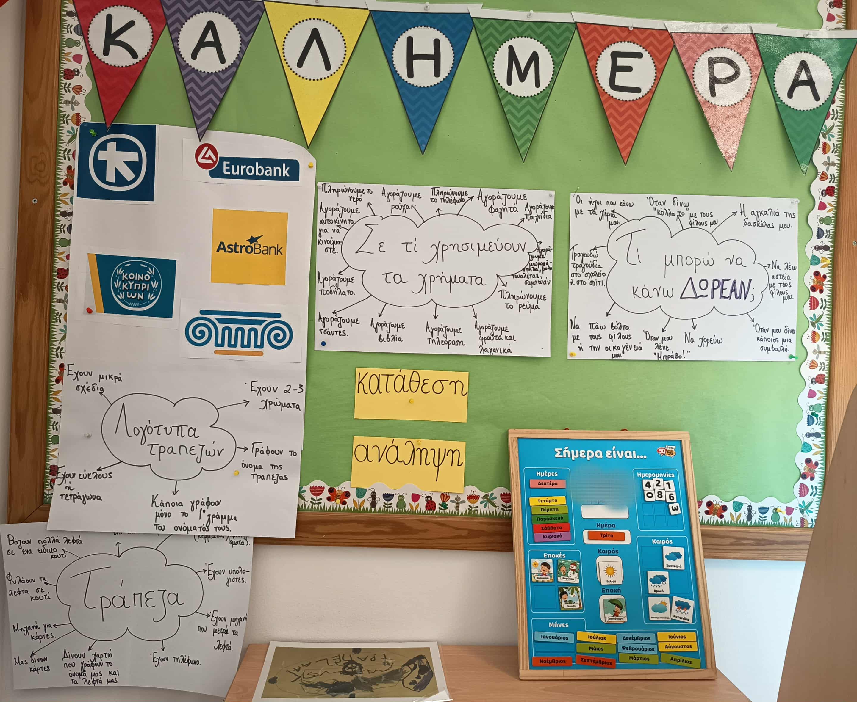 Στα πλαίσια του κοινωνικο-δραματικού παιχνιδιού δημιουργήσαμε με τα παιδιά το Κέντρο Μάθησης: “ Τράπεζα”. Στην “ Τράπεζα” τα παιδιά αναλαμβάνουν τους ρόλους του ταμία και πελάτη και αναπτύσσουν σενάρια. Μέσα από το παιχνίδι θα έρθουν σε επαφή με όρους όπως: χρήματα, αποταμιεύω, κατάθεση, ανάληψη. Συζητήσαμε για τη χρησιμότητα των χρημάτων, το λόγο που είναι σημαντικό να μην τα σπαταλάμε (π.χ δεν είναι απαραίτητο πάντα να αγοράσω κάτι) αλλά και ποιά πράγματα μπορούμε να τα έχουμε “ Δωρεάν” (π.χ μια βόλτα στο πάρκο, μια αγκαλιά).
