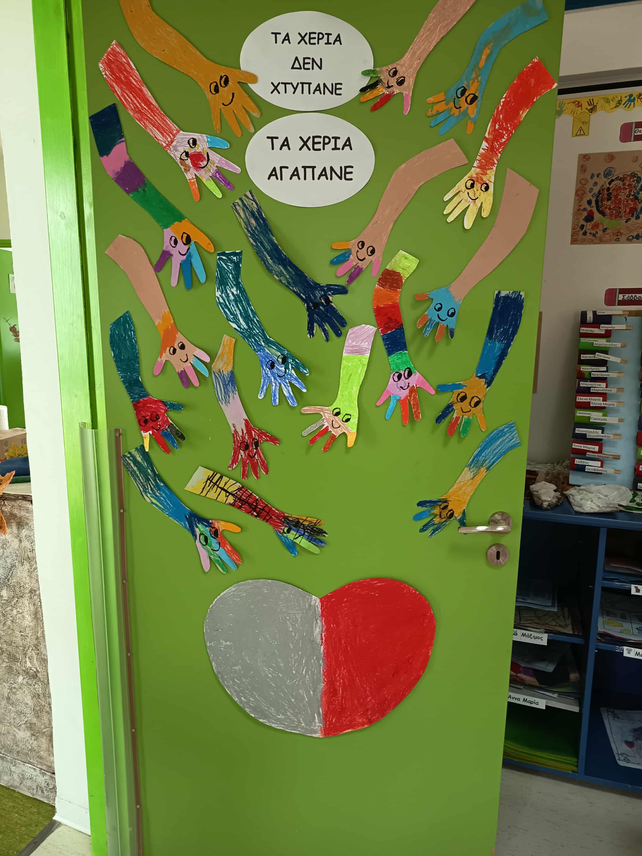 Ζωγραφίσαμε “καλά χεράκια” με χρώματα και διακοσμήσαμε την πόρτα της τάξης μας.