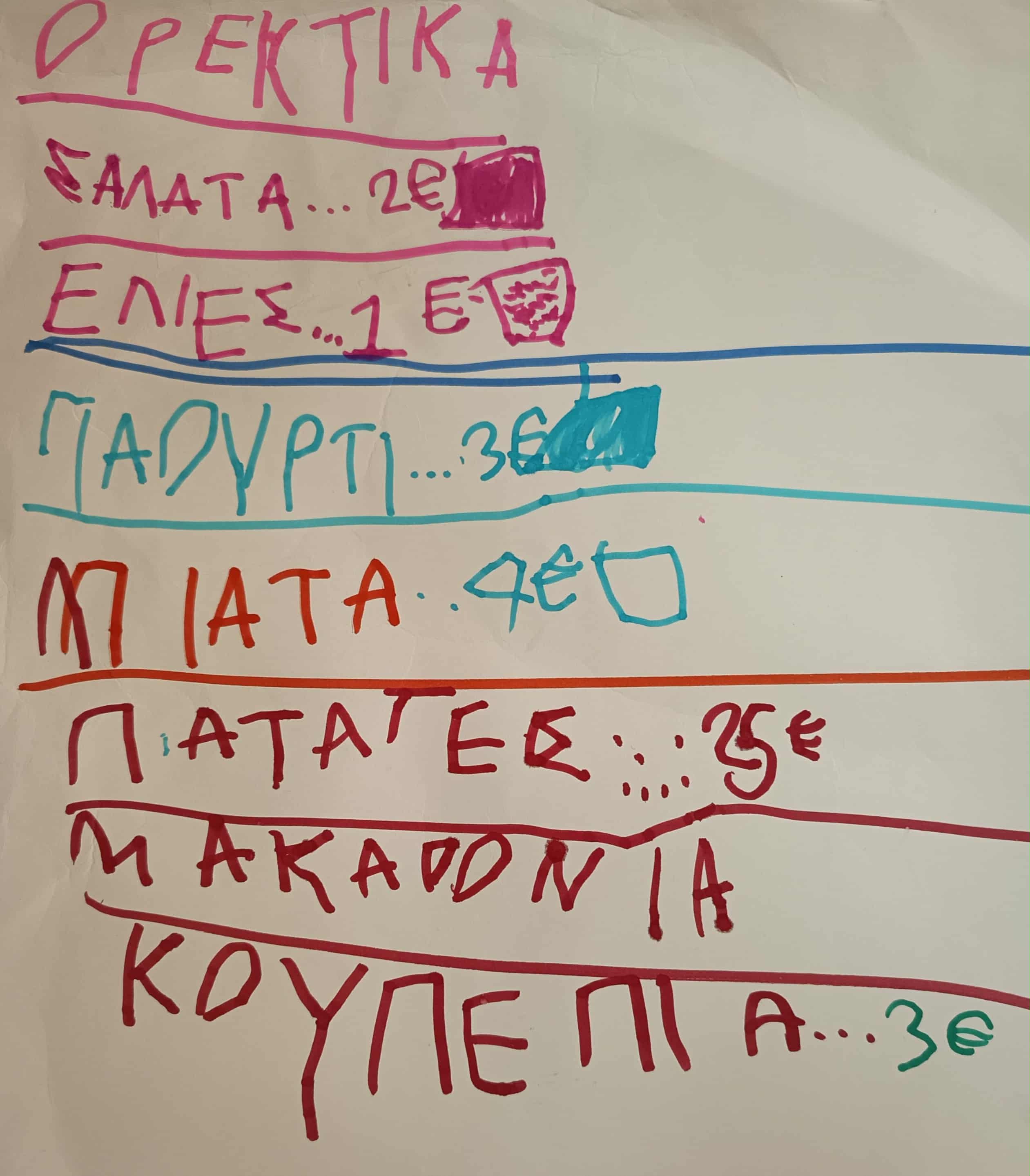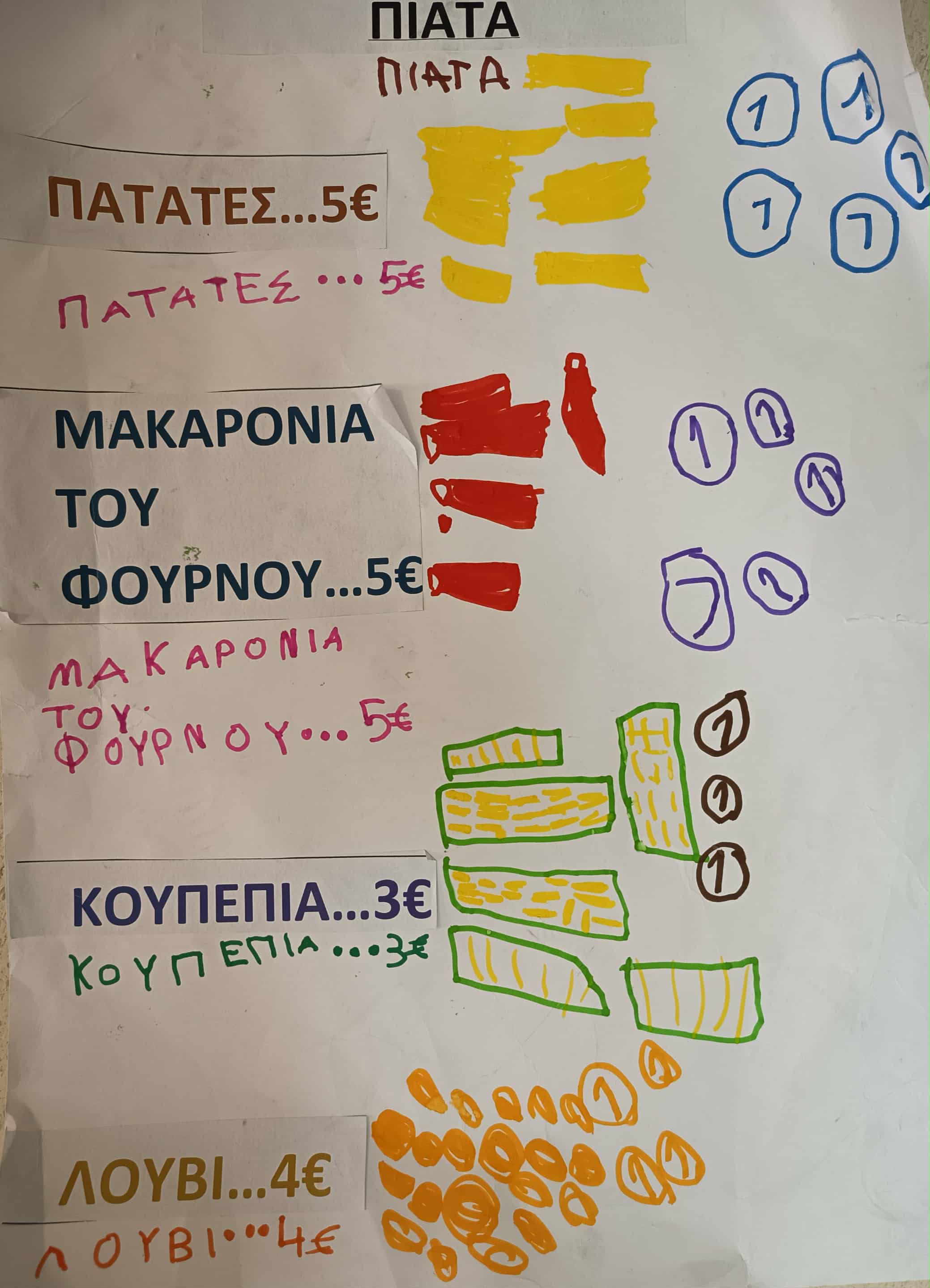 Σκοπός του μενού είναι να ενημερώνει τον πελάτη για τις επιλογές που έχει, ώστε να αποφασίσει τι θα παραγγείλει. Στην τάξη μας τα παιδιά δημιουργούν το δικό τους μενού, μαθαίνοντας να οργανώνουν πληροφορίες, να χρησιμοποιούν λέξεις σχετικές με το φαγητό και να εξασκούν τη γραφή μέσα από το παιχνίδι.